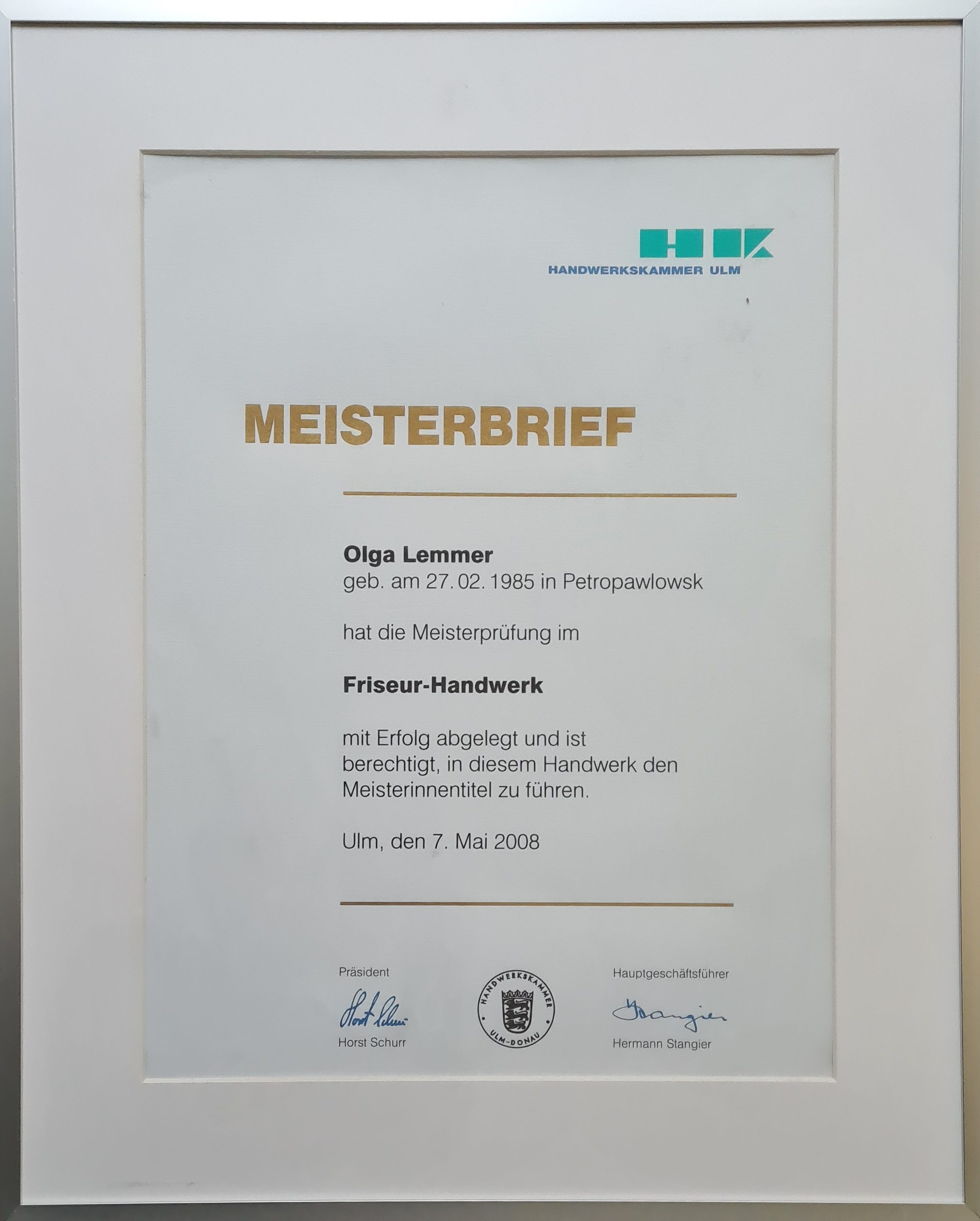 Nach zwei Jahren als stellvertretende Salonleitung konnte ich auch die Meisterschule mit Erfolg abschließen.